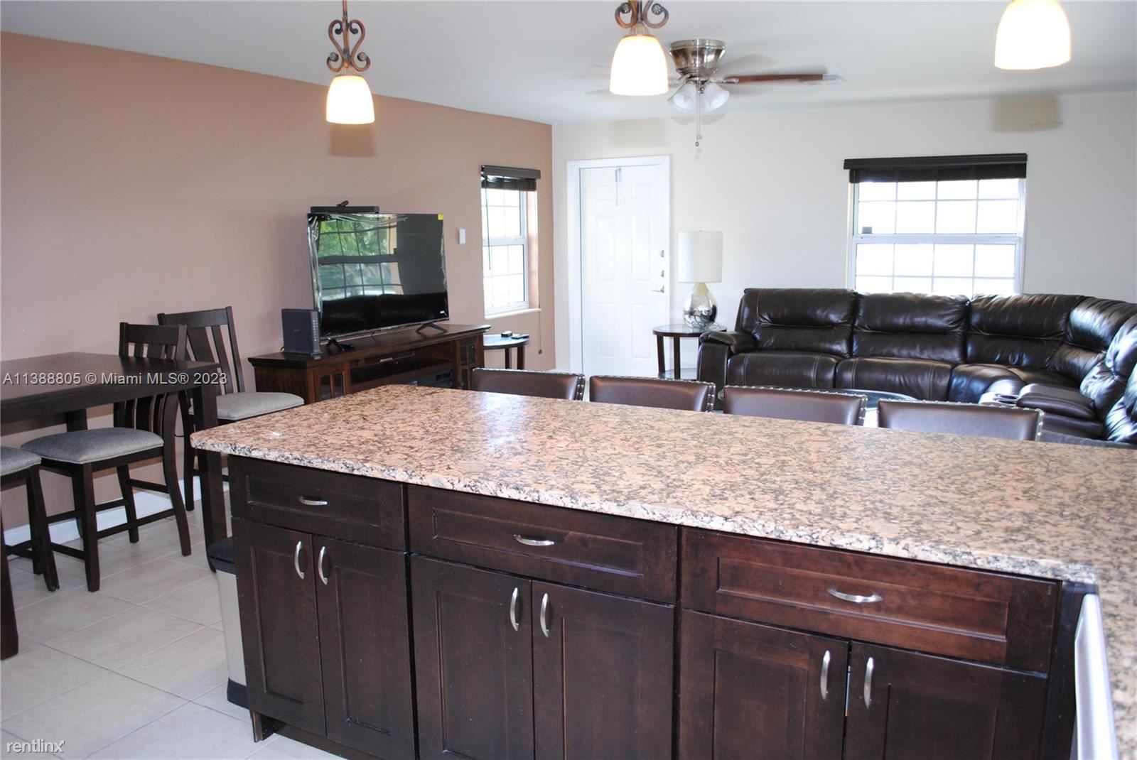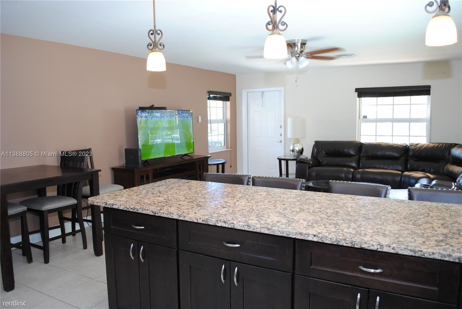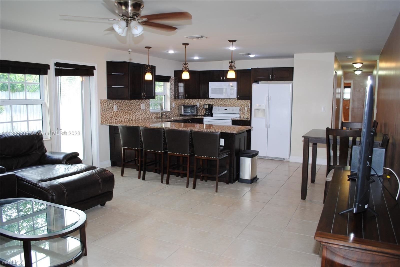 This well-maintained move-in furnished home is ideal for entertaining featuring a stunning fenced-in yard that has 3 covered gazebos all on pavers w/river rock. Immaculate landscaping with tropical palm trees, exterior electrical outlets & outdoor yard lighting for entertaining, plus security lights. Lovely front porch; sprinkler system with timer; solar panels & hurricane impact windows; kitchen upgraded granite countertops complementary backsplash, recessed & pin-lighting over breakfast bar; pantry, Tank-less water heater, laundry room with custom cabinets & storage closet; linen closet, master bedroom has a bath & walk-in closet. Spacious 1 car garage w/double driveway for parking 6 cars